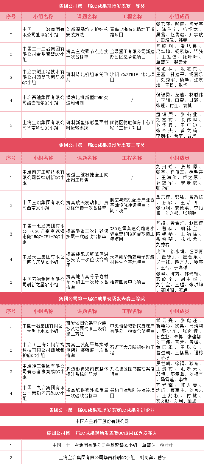 1月28日,由集團(tuán)公司企業(yè)管理部主辦,中國二十二冶集團(tuán)有限公司承辦的集團(tuán)公司第一屆QC成果現(xiàn)場發(fā)表賽活動在河北唐山召開。本次活動中,公司組織推薦13家子企業(yè)的14項(xiàng)質(zhì)量管理小組成果斬獲佳績,其中一等獎5項(xiàng)、二等獎5項(xiàng)、三等獎4項(xiàng)。此外,中國冶金科工股份有限公司榮獲集團(tuán)公司“QC成果先進(jìn)企業(yè)”,中國二十二冶集團(tuán)有限公司單慧芝、徐葉葉,上海寶冶集團(tuán)有限公司劉高賓、曹寧榮獲集團(tuán)公司“QC成果優(yōu)秀發(fā)布人”QC小組活動的扎實(shí)開展,有利于激發(fā)現(xiàn)場人員解決質(zhì)量問題、實(shí)施質(zhì)量改進(jìn)的積極性和創(chuàng)造性,推進(jìn)質(zhì)量人員素質(zhì)和意識有效提升,營造“全員參與質(zhì)量,人人關(guān)心質(zhì)量”的氛圍,以實(shí)際行動助推企業(yè)高質(zhì)量發(fā)展。
